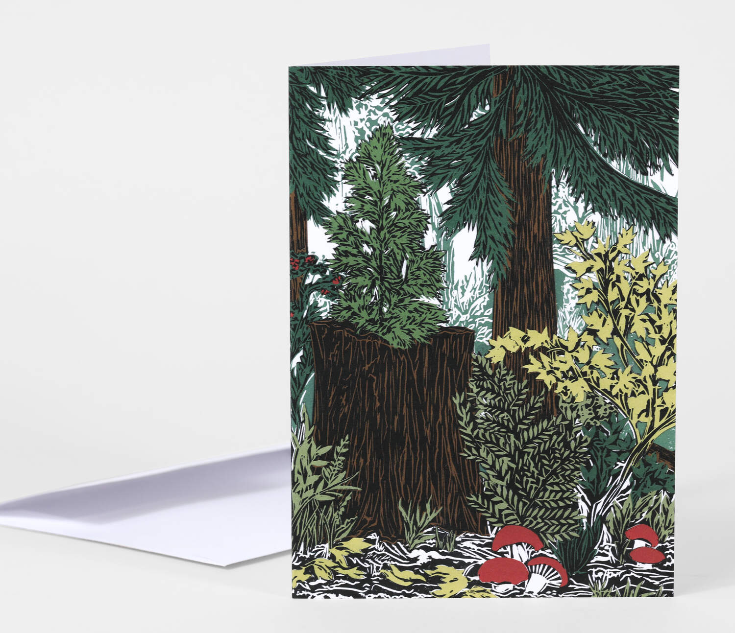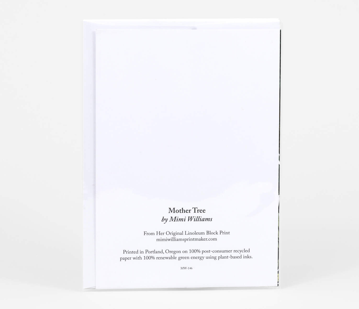 Mimi carves each of her striking images in a linoleum block, then impresses the inked carving onto the paper using the back of a wooden spoon.