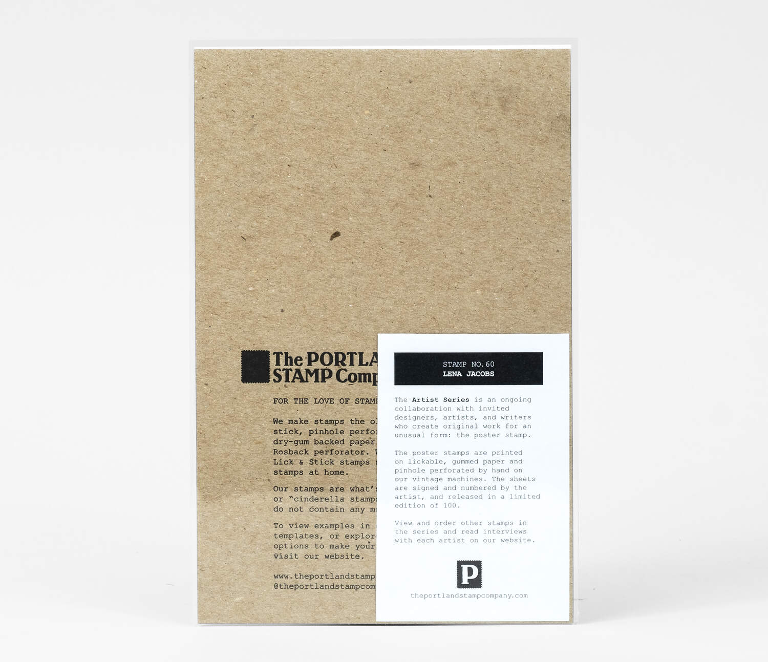 The Portland Stamp Company's Artist Series is an ongoing collaboration with invited designers, artists, and writers who create original work for an unusual form: the poster stamp. The poster stamps are printed on lickable, gummed paper and pinhole perforated by hand on their vintage machines.