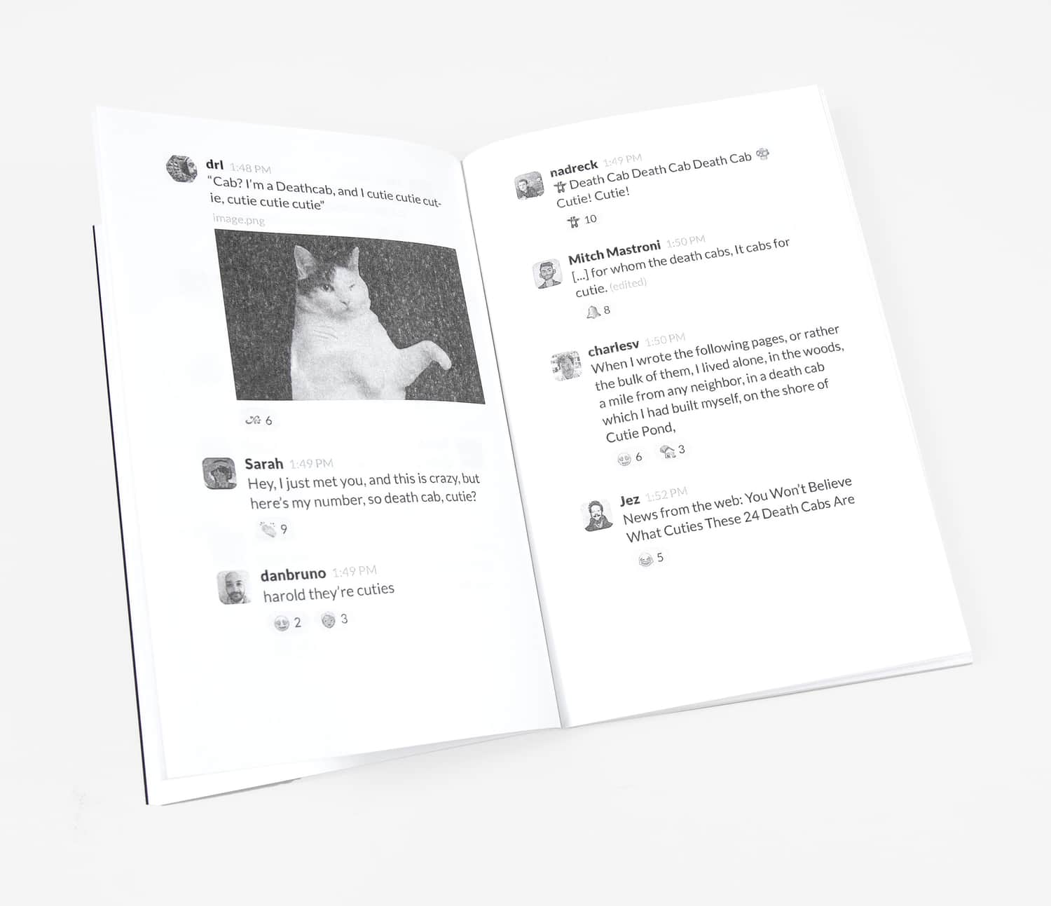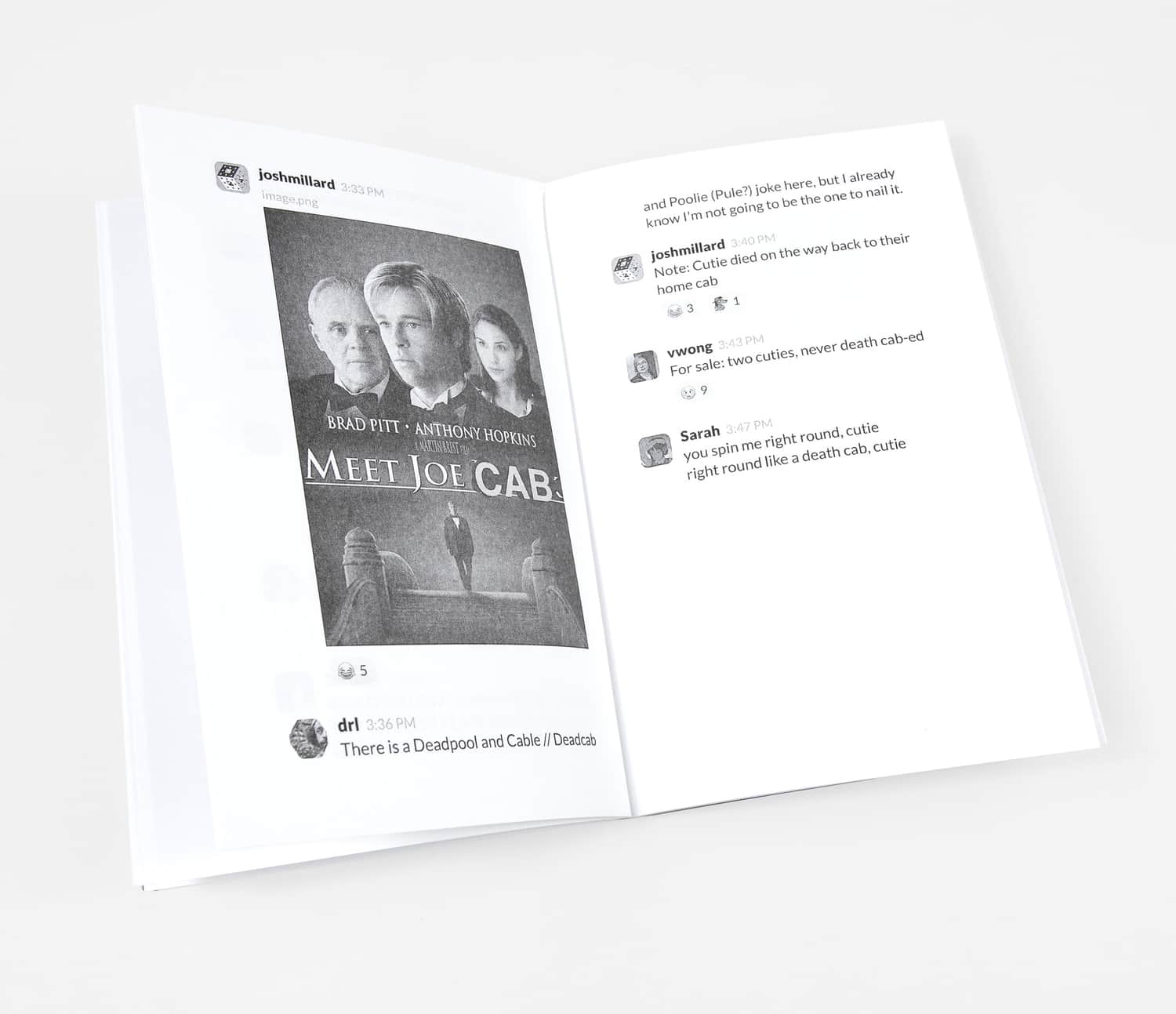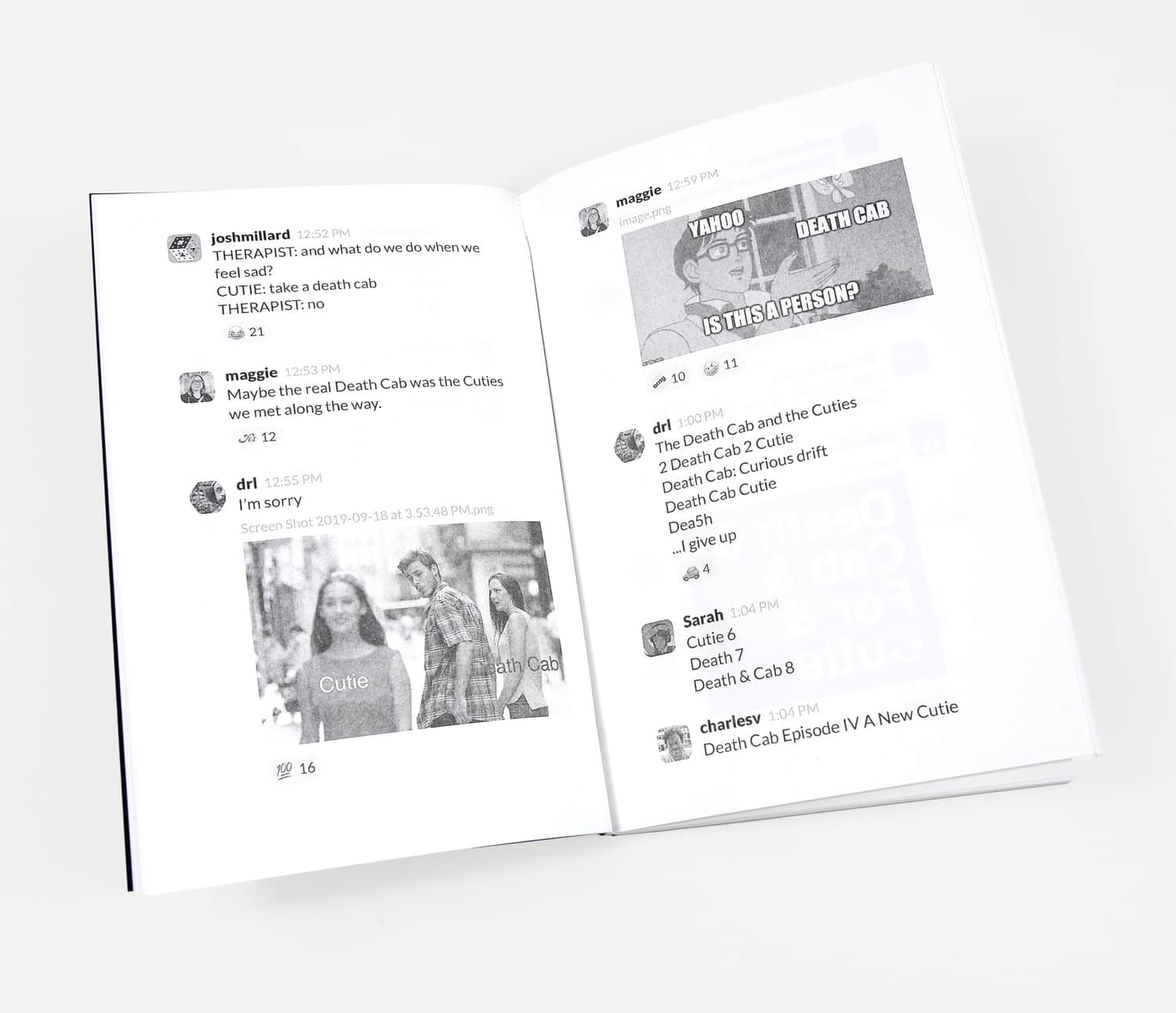 The zine documents an infamous thread in the XOXO Slack where over 60 community members shoehorned the band Death Cab for Cutie into as many memes as possible over the course of six days. If you know, you know.