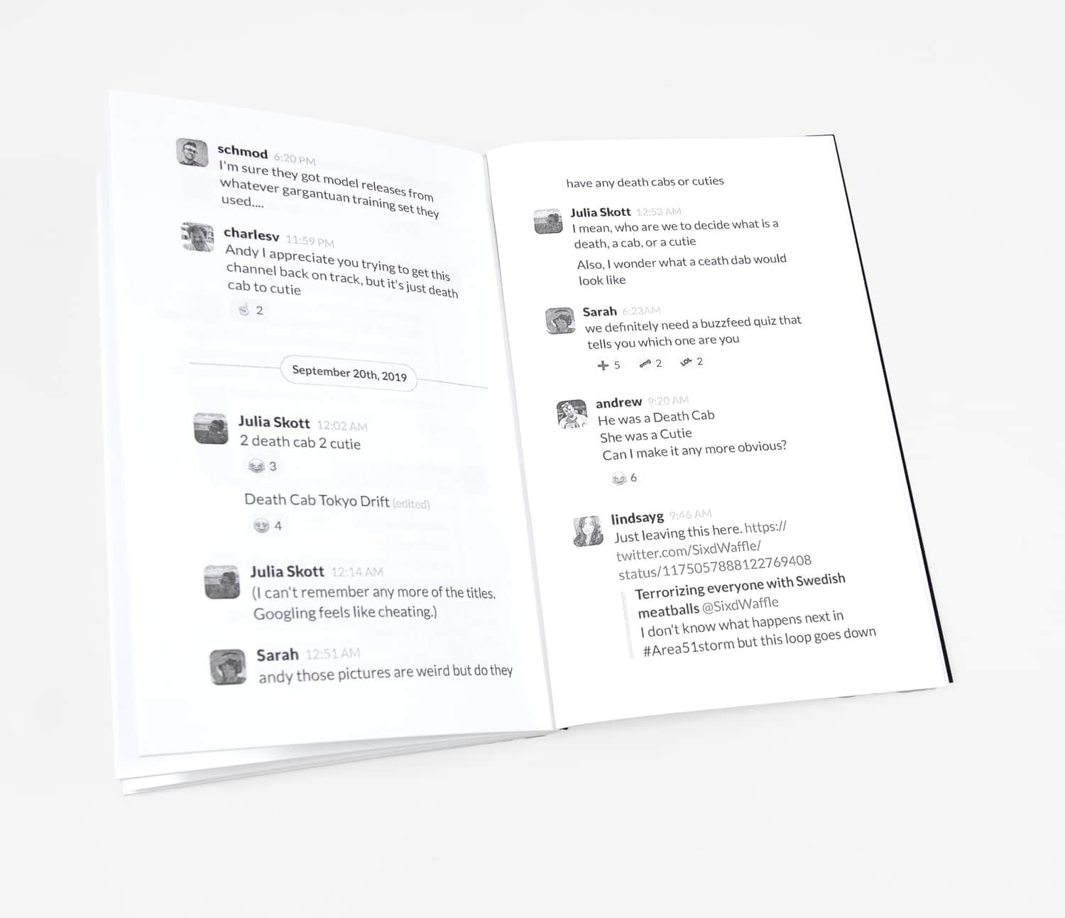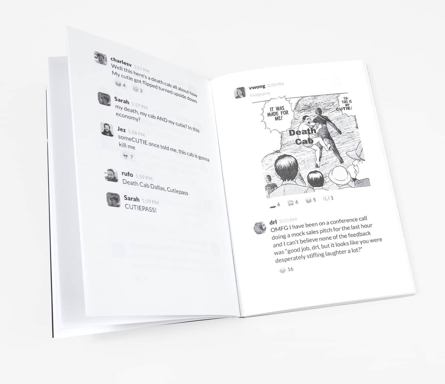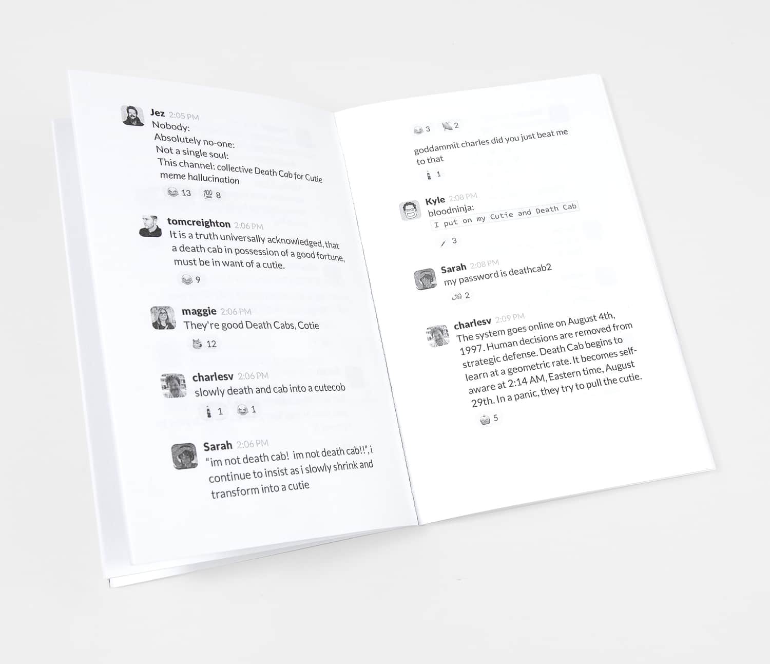 The zine documents an infamous thread in the XOXO Slack where over 60 community members shoehorned the band Death Cab for Cutie into as many memes as possible over the course of six days. If you know, you know.